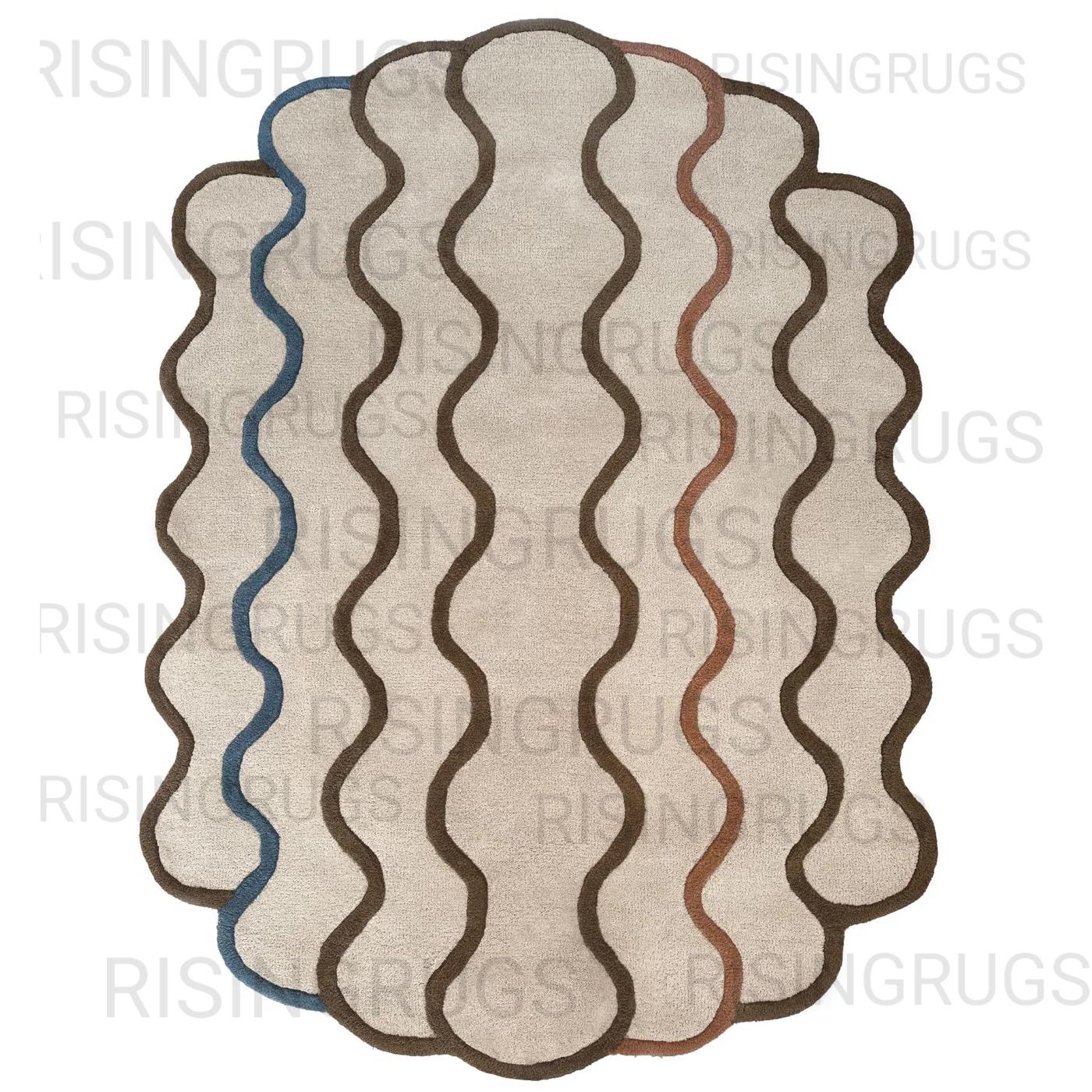 Bring a touch of movement and modern artistry into your space with this Hand-Tufted Wool Rug, featuring a beautiful wavy border design and softly scalloped edges. The dynamic lines in blue, brown, and terracotta tones flow gracefully over a neutral beige base, giving your room a stylish sense of rhythm and warmth.