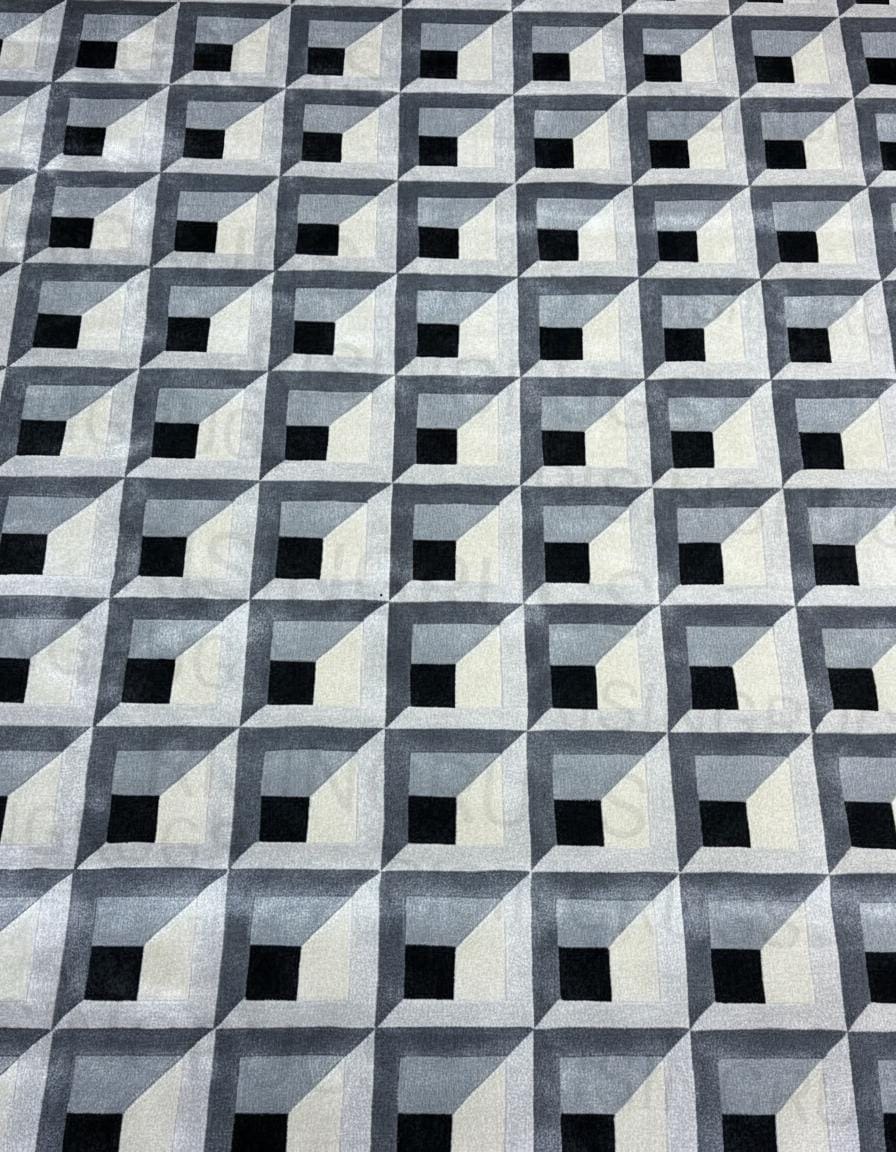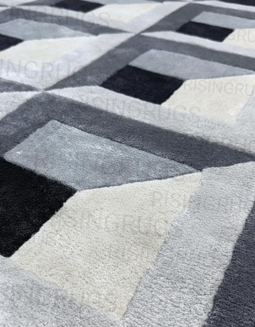 This stunning hand-tufted masterpiece is crafted using 100% premium Tencel fiber, known for its silk-like luster, smooth texture, and eco-friendly nature. The mesmerizing 3D optical illusion pattern in elegant tones of grey, ivory, and black adds a striking visual depth, creating a luxurious statement in any modern space.