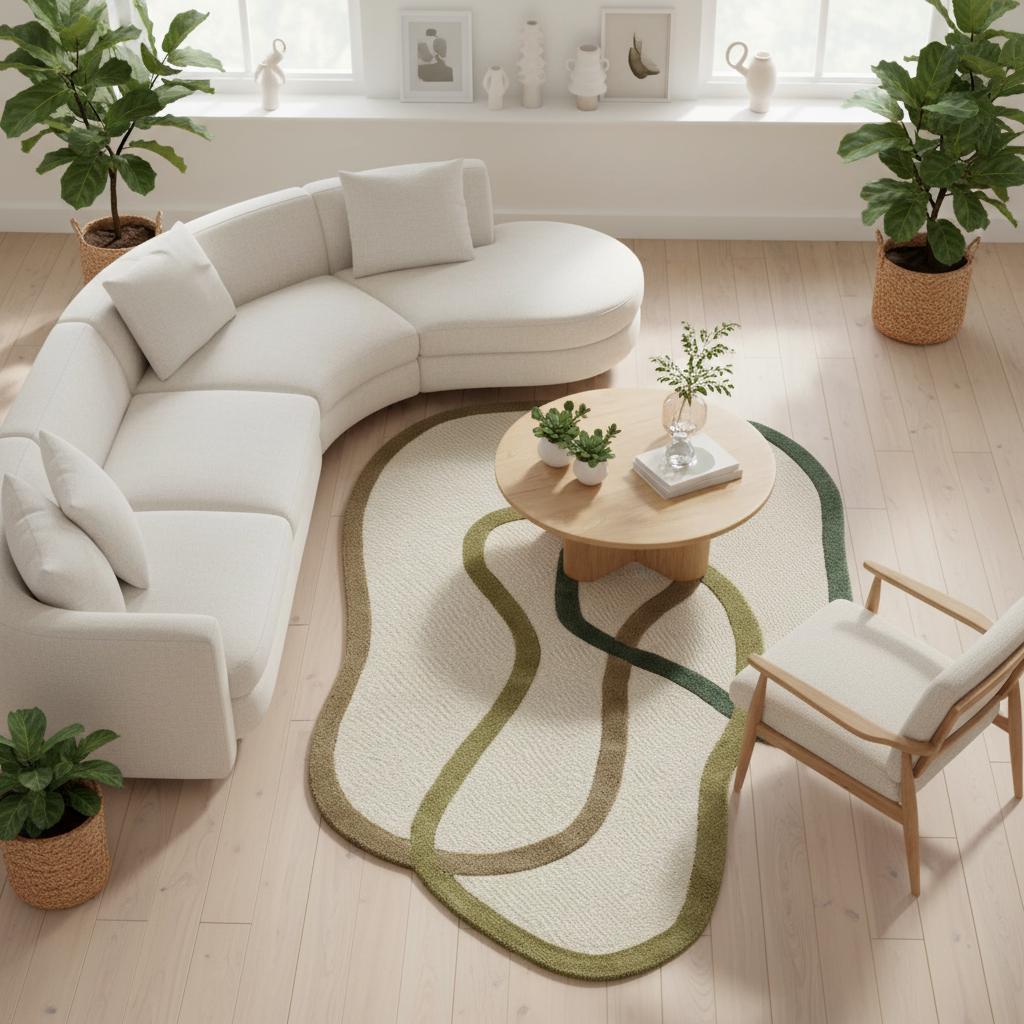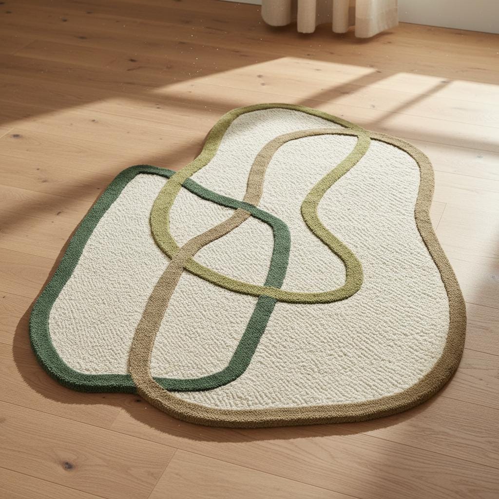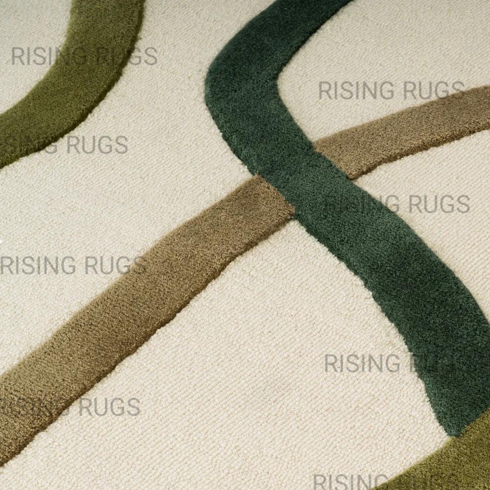 Hand-Tufted Wool Rug – Green Abstract Line Art, Custom Shape